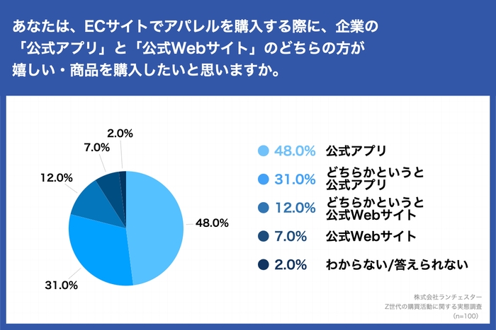「ECサイトでアパレルを購入する際に、企業の「公式アプリ」と「公式Webサイト」のどちらの方が嬉しい・商品を購入したいと思いますか。」(n=100)と質問に対し、「公式アプリ」が48.0%、「どちらかというと公式アプリ」が31.0%と、Z世代の約8割が「公式アプリ」での商品購入を希望していることがわかった。