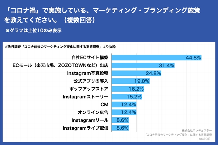 先行調査では、企業側のコロナ禍のマーケティング施策は「自社ECサイト構築」が最多、「公式アプリ」は2割未満
