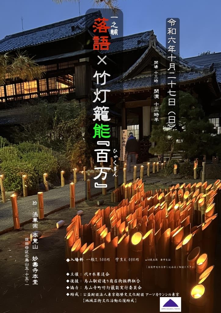 代々木果迢会主催、一之輔落語×竹灯籠能『百万(ひゃくまん)』が2024年10月27日 (日)に妙寿寺(東京都 世田谷区 北烏山 5-15-1)にて開催されます。