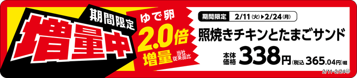 14日間限定増量中!ゆで卵2.0倍増量※1 「照焼きチキンとたまごサンド」 2月11日(火)~2月24日(月)実施