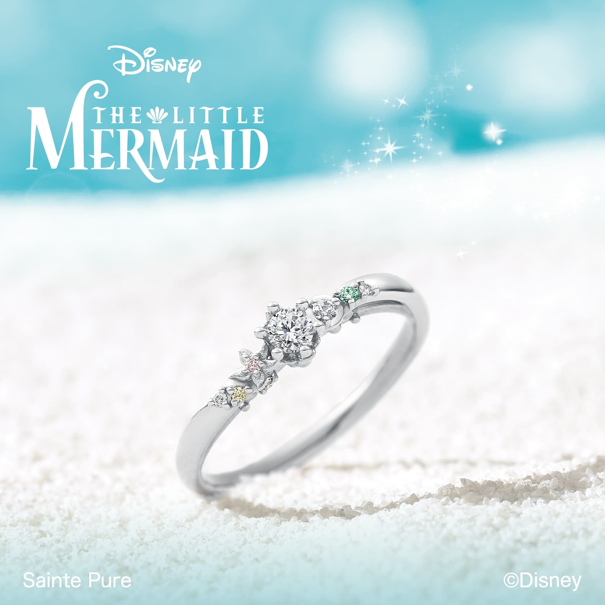 アリエルと海の仲間たちを様々なモチーフとカラフルな宝石で色彩豊かに表現した限定エンゲージリング。