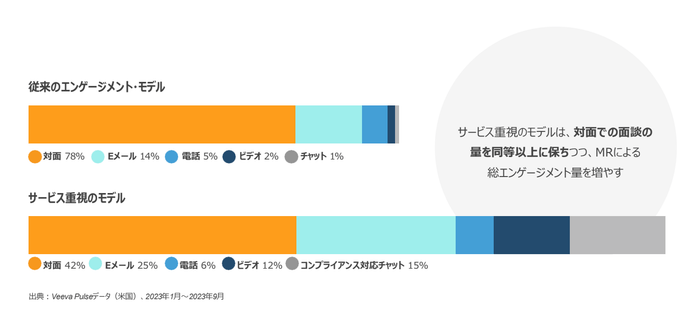 Veeva Systems【NYSE:VEEV】(本社:カリフォルニア州プレザントン、日本法人本社:東京都渋谷区、日本法人代表取締役:Sebastian Bather、以下Veeva)は、本日Veeva Pulseフィールドトレンドレポートの最新分析を発表し、双方向のデジタルコミュニケーションチャネルが現場のエンゲージメントに与える影響を示しました。その結果、コンプライアンス対応チャットへのアクセスがエンゲージメントチャネルミックスを拡大し、医師とのデジタルタッチポイントを2倍以上に増加させる一方で、対面での面談を維持または増加させることが明らかになりました。