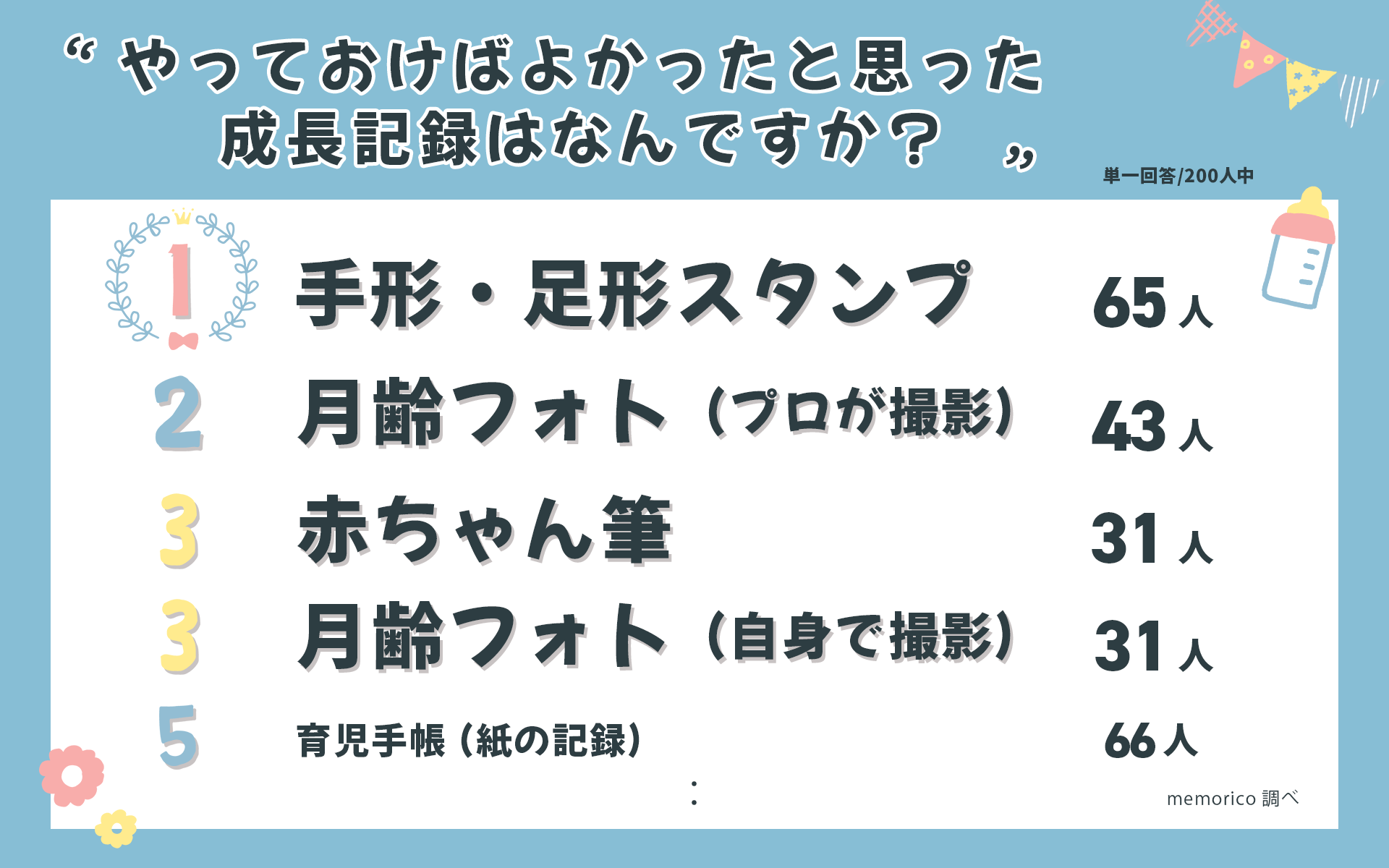 CreativePocket株式会社が企画運営する子育てメディア『memorico(メモリコ)』の編集部では、「成長記録・思い出・出産祝い」について、0歳児の子育て経験のあるママパパ、200名を対象にアンケート調査を実施。