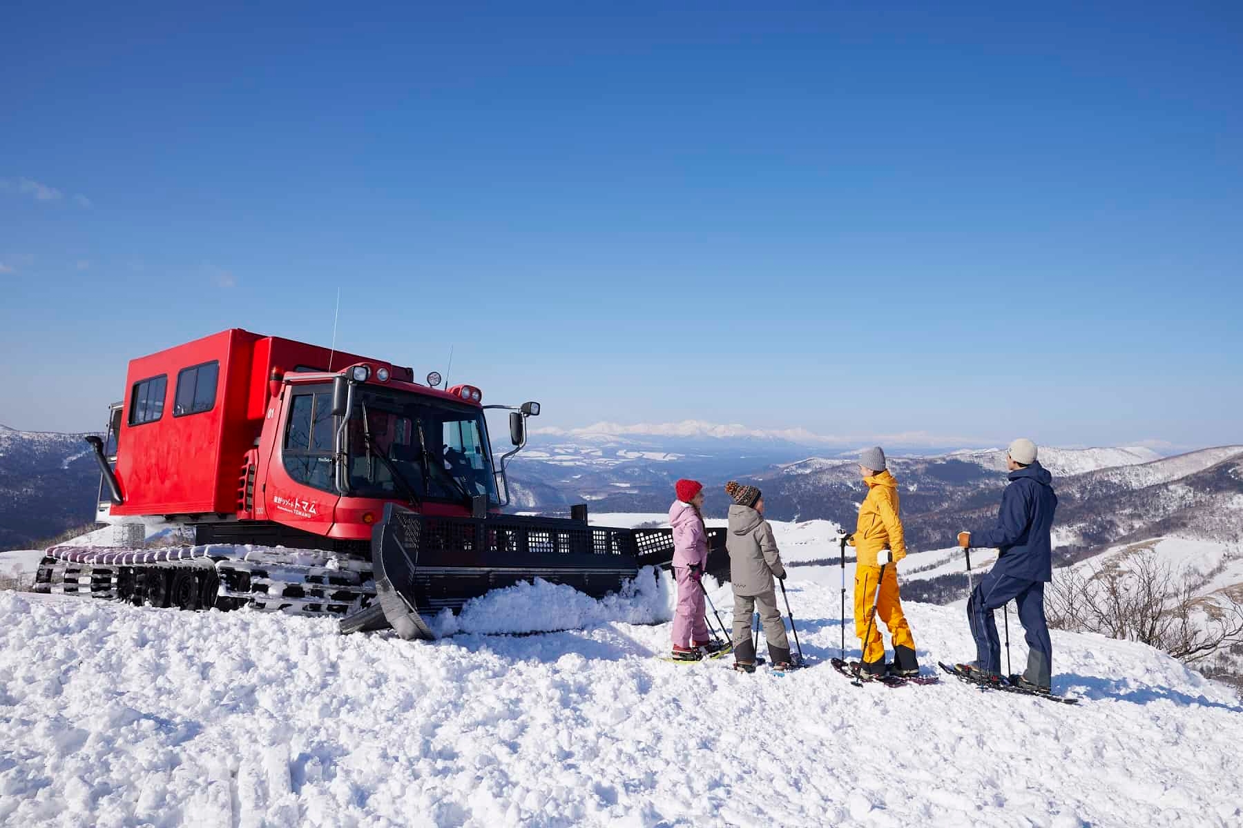 当アクティビティの舞台は、狩振岳エリアです。これまでは、上級者のスキーヤーやスノーボーダーしか行くことができなかった場所で。標高約1,100メートルの山頂部まで、雪上車「CAT(*4)」で向かいます。CATは暖房設備が万全で快適に登山できるので、寒さや雪道に対する心配はありません。山頂部に到着すると、北海道の中央部にある大雪山系や日高山脈、十勝平野など、雪で覆われた真っ白な大パノラマが広がります。1日3組限定のアクティビティなので、白銀の絶景を堪能できます。