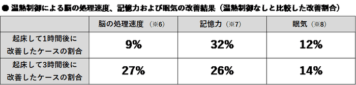 最も良好な睡眠状態が得られる温熱制御で実験した約50のケースにおいて、温熱制御を実施しない場合と比べて、脳の処理速度と記憶力のパフォーマンス向上に寄与する結果が得られた。