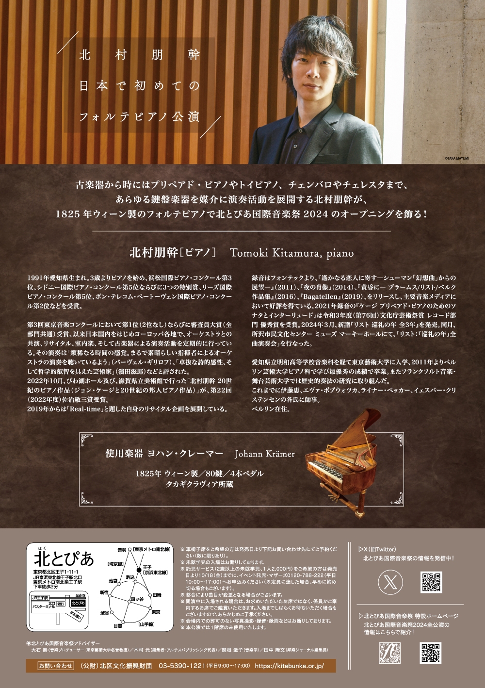 2022年びわ湖ホール及び滋賀県立美術館で行われた「北村朋幹 20世紀のピアノ作品(ジョン・ケージと20世紀の邦人ピアノ作品)」で佐治敬三賞を受賞するなど幅広い活躍を見せる北村朋幹。留学先のドイツでは様々なピリオド楽器を演奏し、歴史的奏法の研究に取り組んできた、言わば隠れたフォルテピアノの名手です。その北村朋幹が日本での初めてのフォルテピアノ・リサイタルで北とぴあ国際音楽祭2024のオープニングを飾ります。