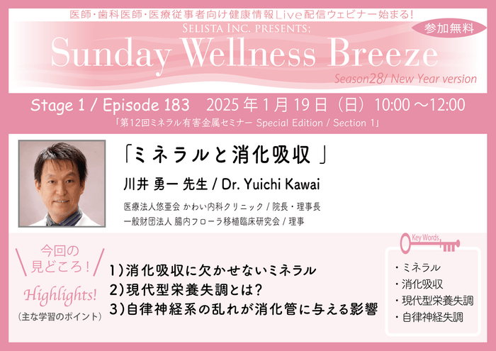 《医師・歯科医師・薬剤師向け》 無料オンラインセミナー1/19(日)朝10時開催 『ミネラルと消化吸収』 講師:川井 勇一 先生 (医療法人悠亜会 かわい内科クリニック/院長・理事長)