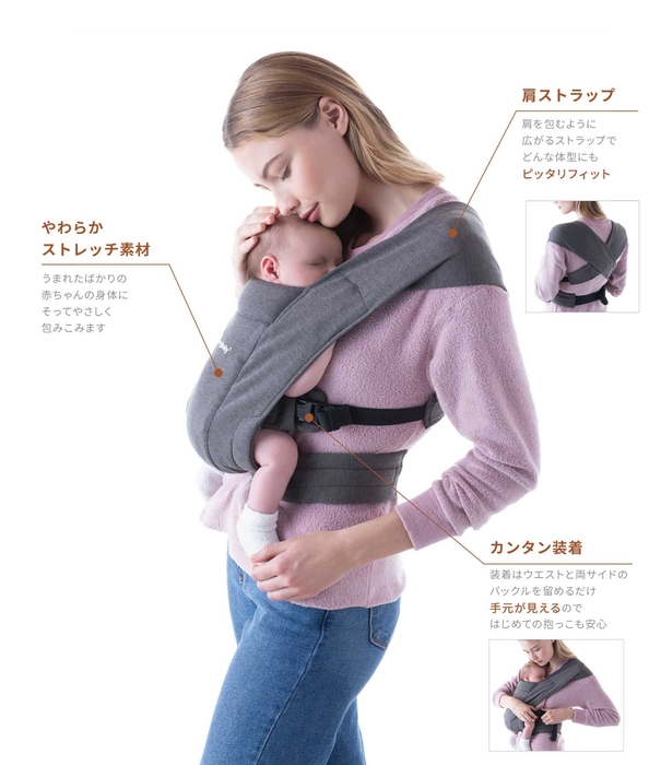 やわらかなストレッチ素材が、ママやパパと赤ちゃんの体を一つに包み込み、ぴったりと抱っこされた赤ちゃんは安心して過ごすことができます。肩ストラップと、ウエストベルトで赤ちゃんの体重をバランスよく分散して支えるエルゴベビー・ベビーキャリアの特徴はそのままに、首がすわる前の姿勢の安定しない新生児期に特化した仕様を実現し、初めての抱っこでもスムーズにおこなえます。軽く、肌触りもよいので、あやしたり、寝かしつけにもぴったり。前向き抱きもできるので室内でも外出先でも活躍できるファーストキャリアです。
