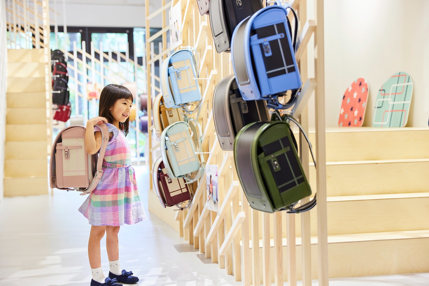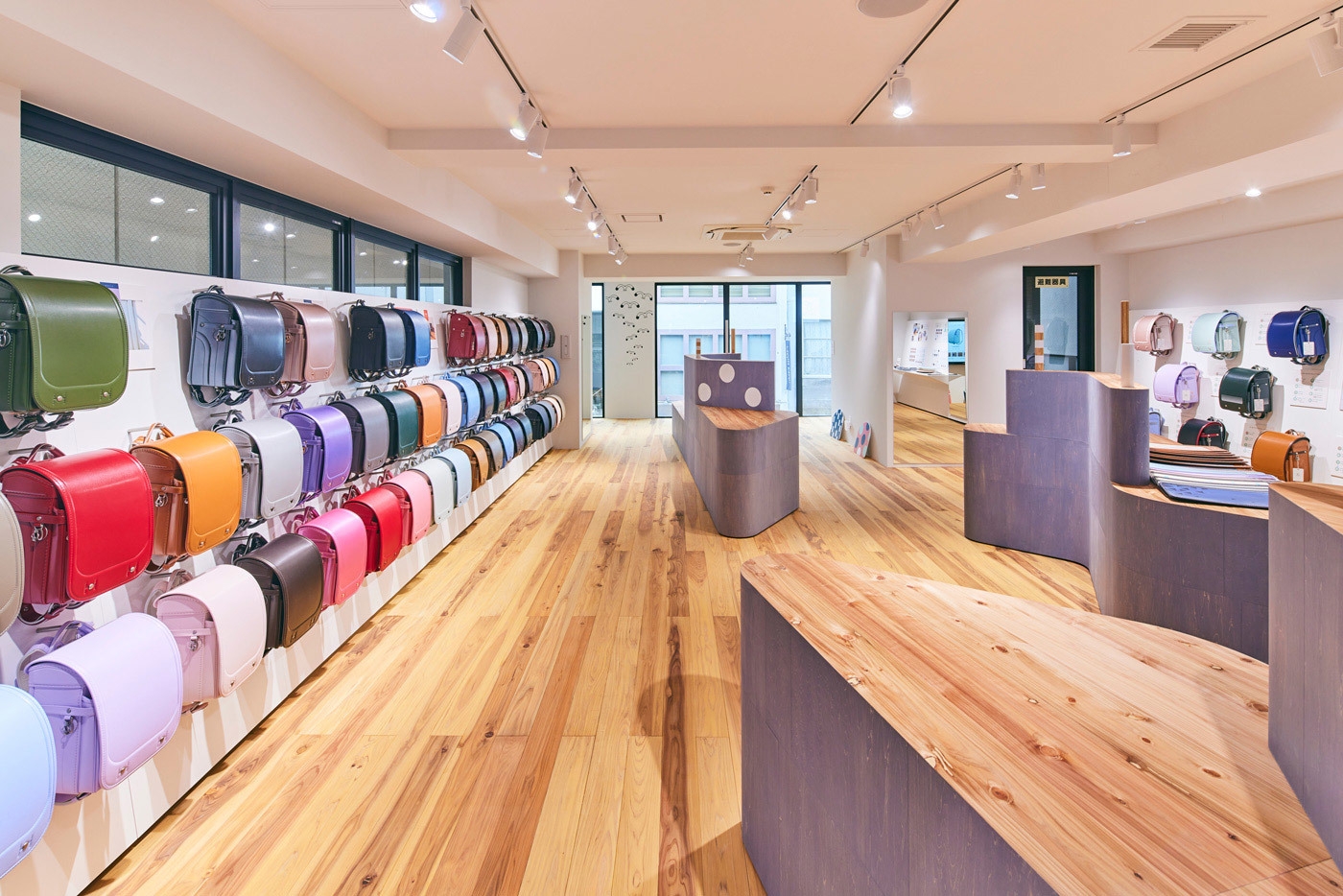 やわらかな日の差し込む明るい店内は、無垢の屋久杉の美しい木目が一面に広がり、ランドセルの彩りをやさしく包みます。