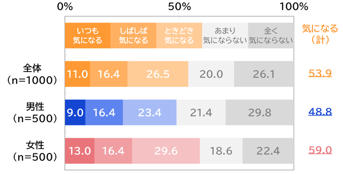 気になる人の割合を男女別にみると、男性では48.8%、女性では59.0%と女性のほうが10ポイント以上高くなっています。