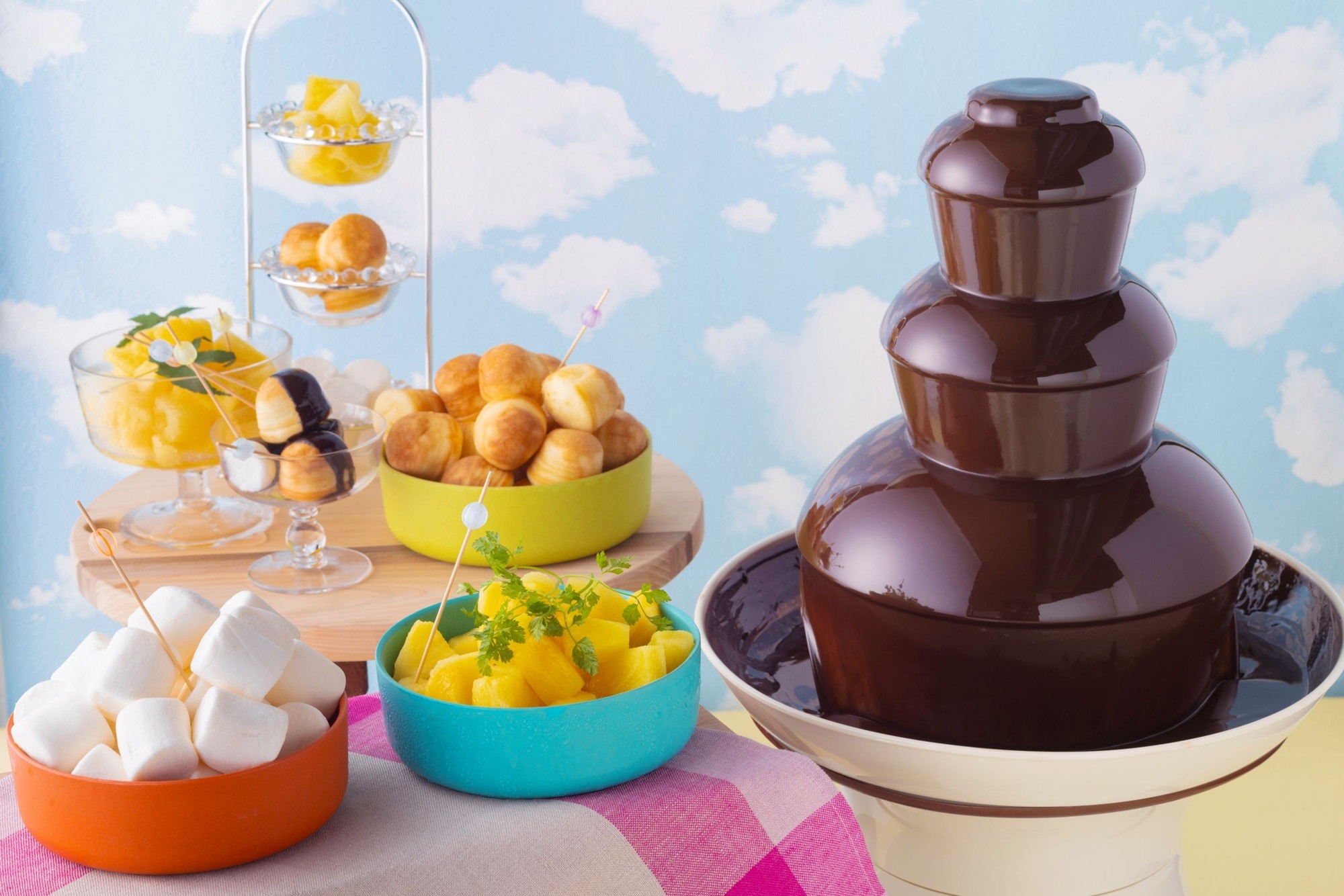お子様が笑顔になるメニューを豊富にご用意しました!みんな大好きなたこちゃんウインナーやフライドポテト、からあげなど、わくわくするメニューが盛りだくさんです。デザートにはチョコファウンテンにフルーツやマシュマロをたっぷりとつけてお召し上がりください。
