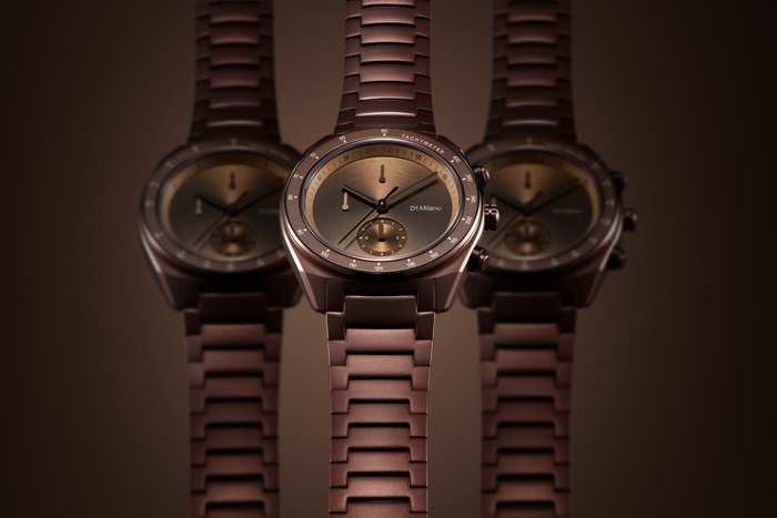ラインナップは、シルバー/ガンメタル/ブラウンの3色展開。中でも注目は、ガンメタル仕上げの“Essential Black”モデル。マットで指紋がつきにくいサンドブラスト加工が施され、重厚で洗練された存在感を放ちます。さらに、インダイヤルやプッシュボタンに加えられた控えめなアクセントカラーが、ミニマルな世界に現代的な息吹を与えています。この絶妙なバランス感覚が、D1 MILANOらしさを象徴しています。