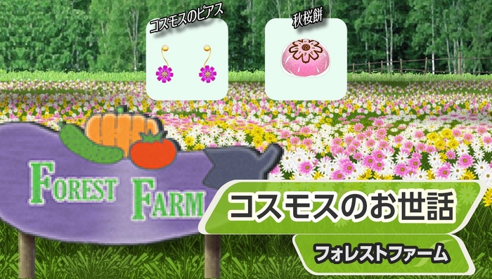 ゲーム内の教会に隣接する『フォレストファーム』は、コスモスが満開のシーズンを迎えました。コスモス畑に水やりのお世話をすると、アクセサリのアバターアイテムや、回復アイテムがもらえます。