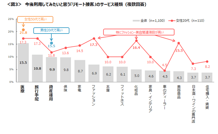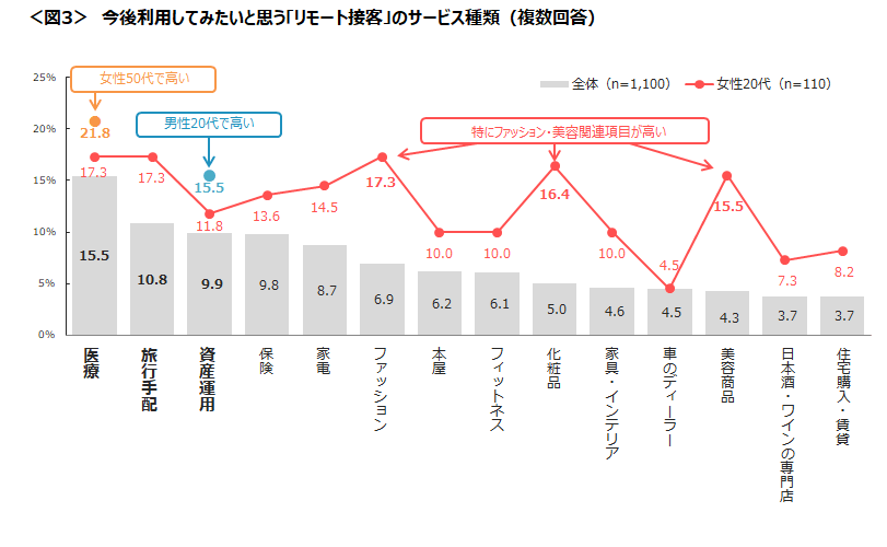 今後利用してみたいと思うリモート接客、1位は医療 女性20代はリモート接客サービスに前向きな姿勢