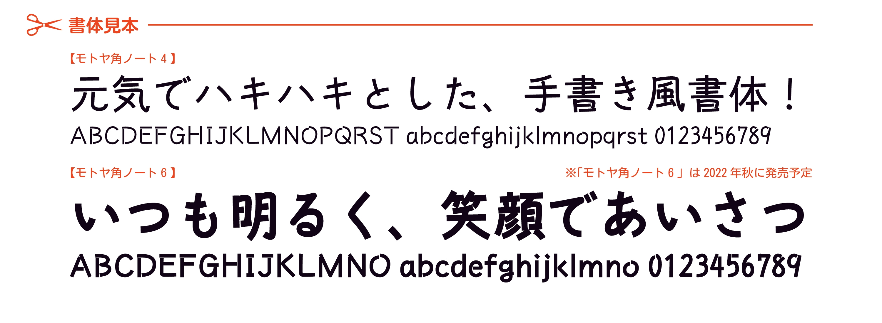 新商品「モトヤ角ノート」は、2018年に発売した手書き風書体「モトヤノート」の骨格を利用したバリエーション書体の一つで、印刷物における小見出し・中見出しをはじめ、テレビテロップなどのデジタル分野でも幅広く活用でき、これまでにない表現を可能としています。