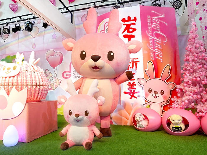 公式キャラクター「イワシカ®」は、岩下の新生姜ミュージアムの一番人気のコンテンツ「ジンジャー神社」を護る、狛犬ならぬ狛鹿。ツノが「岩下の新生姜」になっているピンク色のシカのキャラクターです。