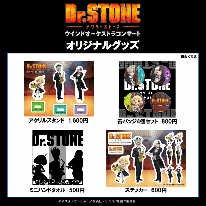 今週末4月3日(日)東京文化会館大ホール(上野)にて、いよいよ開催されるTVアニメ『Dr.STONE』ウインドオーケストラコンサート。本公演限定、オリジナルグッズを発表!人気アニメ『Dr.STONE』初のコンサートのオリジナルグッズは、アクリルスタンド、ミニハンドタオル、缶バッジ4個セット、ステッカーのラインナップ。