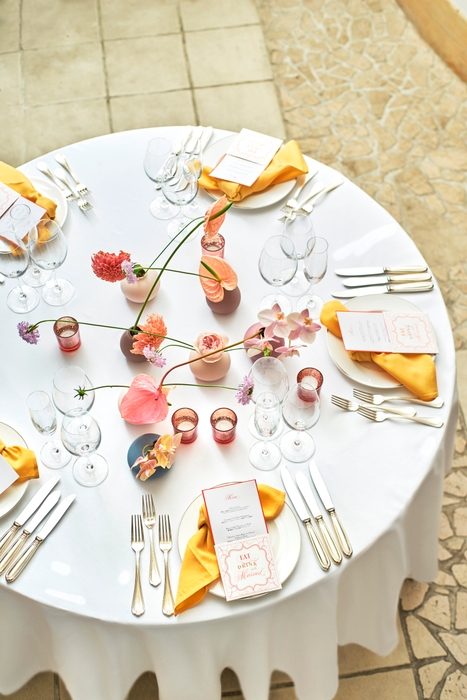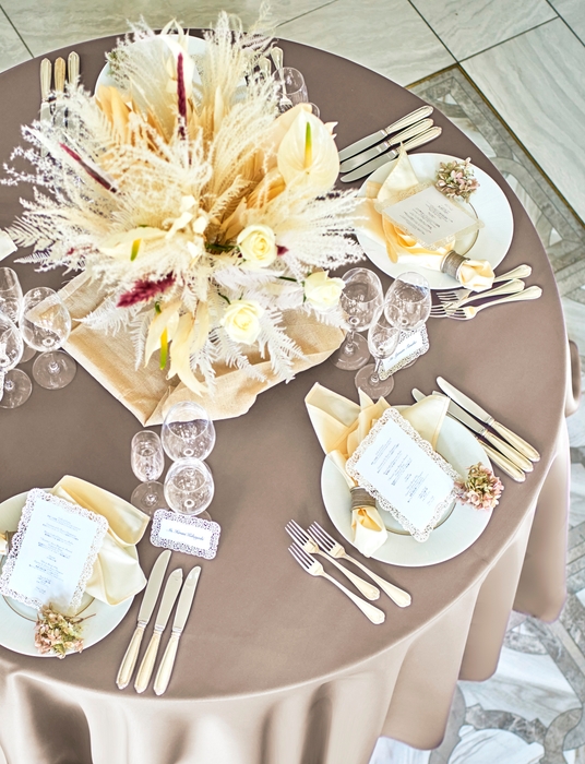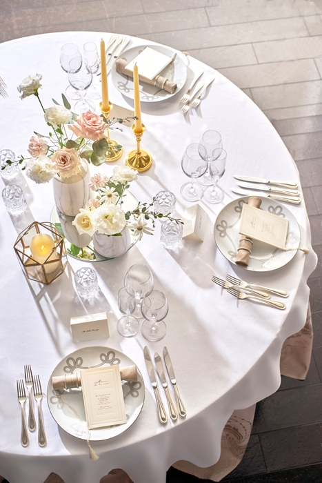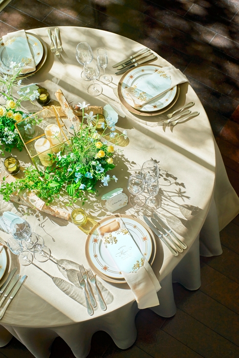 優雅で華やかさのある色合いがおふたりを引き立てる、自然な彩りと香りに包まれたコーディネート。