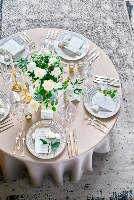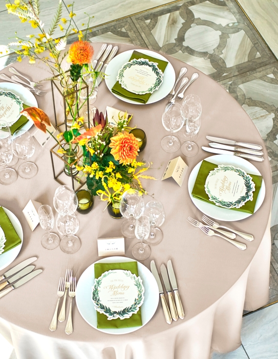 ホワイト、グリーンを基調に、上品で高級感のある洗練を極めた大人ウエディングが叶うコーディネート。
