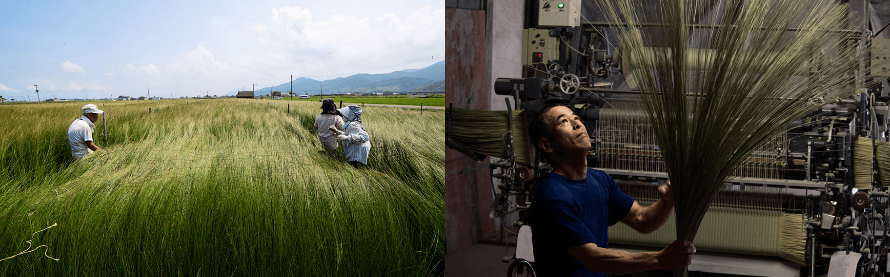熊本県の中でも豊富な水、温暖な気候など、い草の栽培に適した条件がそろっている八代地域は、国内有数のい草産地として国産畳表生産の大部分を担っており、日本の伝統文化である畳表を支えています。