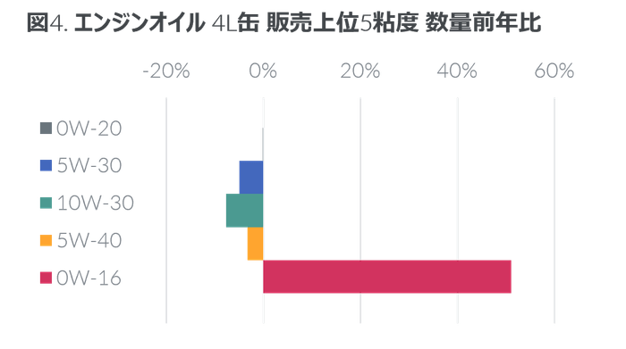 4L缶では0W-20の販売が最も多く、数量ベースで41%を占めた。対して、5W-30の数量構成比は前年同期の23%から22%に、10W-30は15%から14%に縮小した。こうした中、0W-16の販売が好調で数量前年比は51%増に達し(図4)、数量構成比は2%から4%に拡大した。