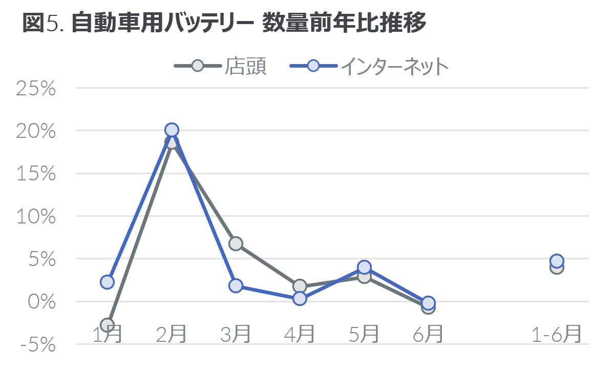 2022年上半期の数量前年比は4%増で、店頭では同4%増、インターネットでは同5%増であった(図5)。月別にみると、昨年より気温が低かった2月は店頭では数量前年比19%、インターネットでは同20%増と大幅に増加した。店頭ではハイブリッド車向け製品が好調で数量前年比26%増と大きく伸長したことで、店頭の平均価格は13,432円と3%上昇した。インターネットではアイドリングストップ車向け製品の価格上昇の影響が大きく、平均価格は9,550円と3%上昇した。結果、金額前年比は店頭では7%増、インターネットでは8%増と堅調であった。