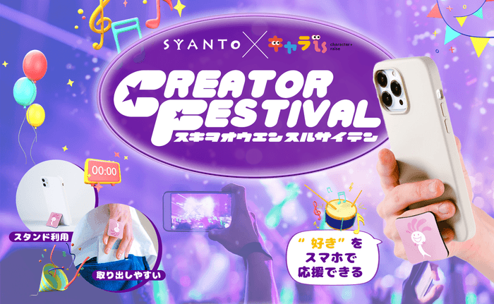 あけび動作の学校株式会社(東京都板橋区、代表取締役:海谷 重利)が展開するスマホスタンドリングのブランド『SYANTO』は、「キャラクターを描きたいクリエイター」と「キャラクターが欲しい人」をつなぐwebサービス「キャラis」(運営:株式会社イオンファンタジー)のプラットフォームを活用し、SYANTOの公式ECサイトにてクリエイターを応援するためのコラボイベント「CREATOR FESTIVAL ~好きを応援する祭典~」を、2023年9月1日(金)PM12時より開催します。
