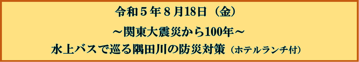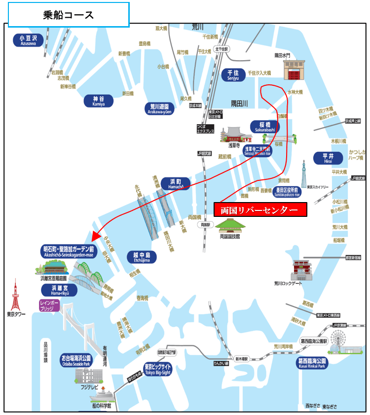 両国リバーセンター受付集合(9時)⇒パールホテル両国2階会議室へ移動⇒災害対策講義(9時15分~10時15分)⇒両国リバーセンターへ移動・トイレ休憩⇒両国リバーセンターにてスーパー堤防解説(10時30分~10時45分)⇒水上バス乗船・両国リバーセンター発着場発(10時50分)RGV※同乗