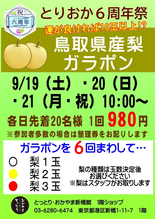 とりおか6周年祭「鳥取県産梨ガラポン」開催!(9/19~21)
