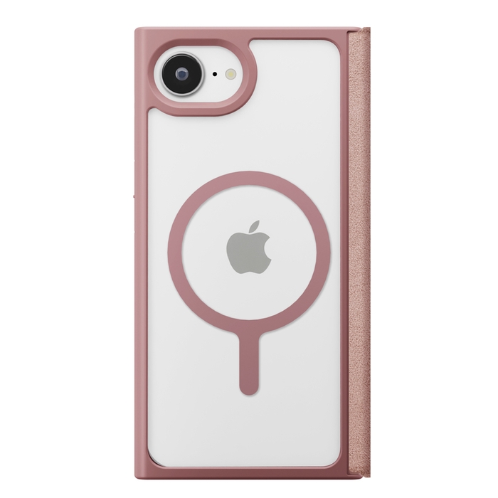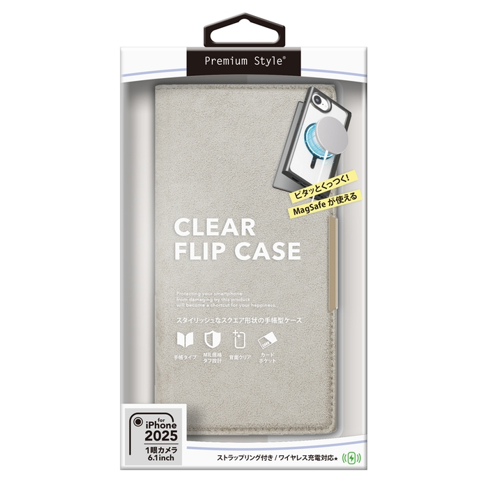 MagSafe対応メタルリングを内蔵したiPhone 16e用 クリアフリップケースです。