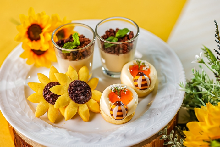 ■メニュー内容:ひまわりクッキー/はちのお家のダブルチーズケーキ/ココナッツミルクの鉢植えパンナコッタ/紅茶とオレンジのオペラ/ひまわりマンゴータルト/さわやかマスカットジュレ/チョコレートマカロン/はちみつレモンのムース/スコーン(ハニーレモンソース)