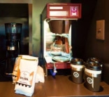 左から、豆のグラインダー(奥)、コーヒー豆、ドリップ機、カップホルダー →