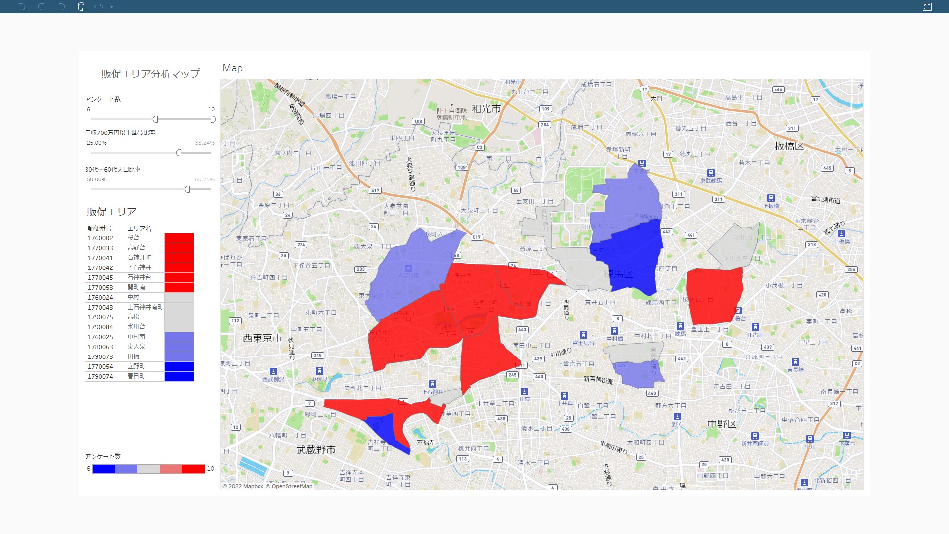 潜在顧客(ターゲット年齢30~60代)と、店舗にて実施したアンケートの結果が良好なエリアを郵便番号からダッシュボードで可視化。年収別世帯数推計データと合わせて販促エリアを絞り込みキャンペーンを実施することで効率的な会員獲得を実現します。