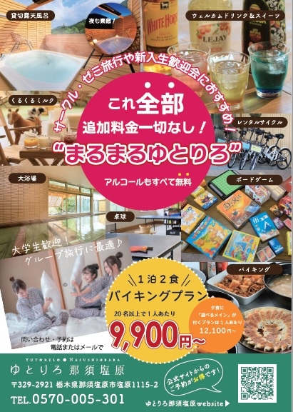 1泊2食9,900円~大学生応援キャンペーン開催「ゆとりろ那須塩原」 <温泉×ご当地グルメ×飲み放題>サークル・ゼミ旅行に