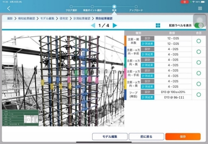 検査は、専用の3眼ステレオカメラを搭載したタブレット端末で柱、梁、壁およびスラブ配筋を立体的に検知し、鉄筋径・本数・ピッチを自動計測、帳票に記録しました(写真2)。