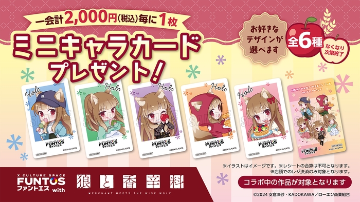 カフェ・グッズコーナーにて一会計2,000円(税込)毎に1枚、ミニキャラカード(全6種)をプレゼントいたします。