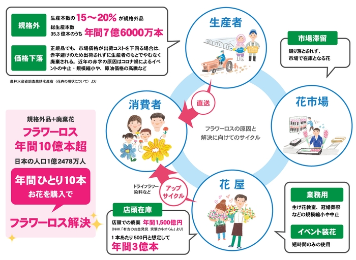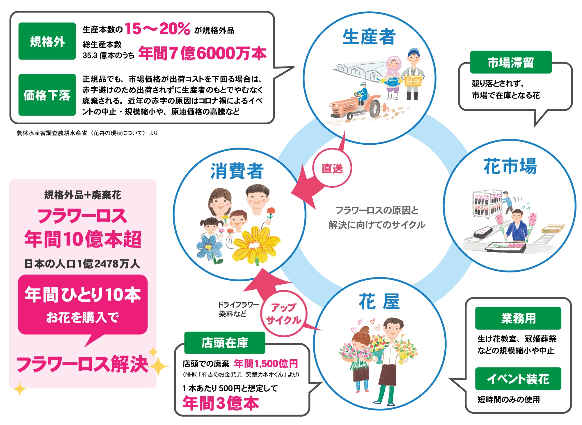 大切に育てたお花が、様々な理由で誰の手にも届かず捨てられてしまう“フラワーロス”という社会課題。一説にはフードロスの約3倍あるといわれています。複層的なこの課題は、農林水産省にも農協にも生花市場にもデータが蓄積されておらず、その実態を正確に把握することが難しいのが現状です。