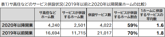 表1はサービスの併設状況を2019年以前と、2020年以降に開設されたホームでそれぞれ集計した結果である。サービスの併設割合は2019年以前では70%だったが、2020年以降では59%と11ポイントも減少。併せて、1ホームあたりの併設数も減少傾向が見られた。