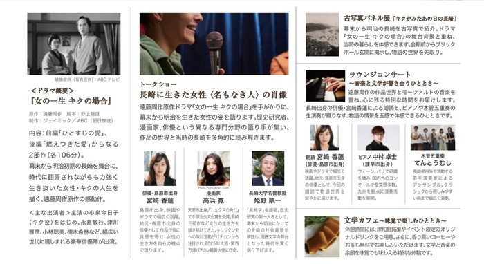 長崎市遠藤周作文学館は、2025年10月11日(土)、ベネックス長崎ブリックホールにて「遠藤周作を偲ぶ一日」(入場無料・定員300人※申込多数の場合は抽選)を開催します。当日は、遠藤周作原作のテレビドラマ『女の一生 キクの場合』(制作:ジェイミック/ABC、主演:小泉今日子)の上映に加え、長崎出身の俳優・宮崎香蓮氏、幕末から明治の長崎を舞台にした作品で国際的に評価される漫画家・高浜寛氏、「長崎学」を提唱する長崎大学名誉教授・姫野順一氏によるトークショーを実施します。また、ピアノと木管五重奏によるラウンジコンサート、文学をテーマにしたオリジナルドリンクや津和野銘菓の提供、古写真展示「キクが見たあの日の長崎」などを組み合わせ、遠藤文学の世界を五感で体感する構成としています。