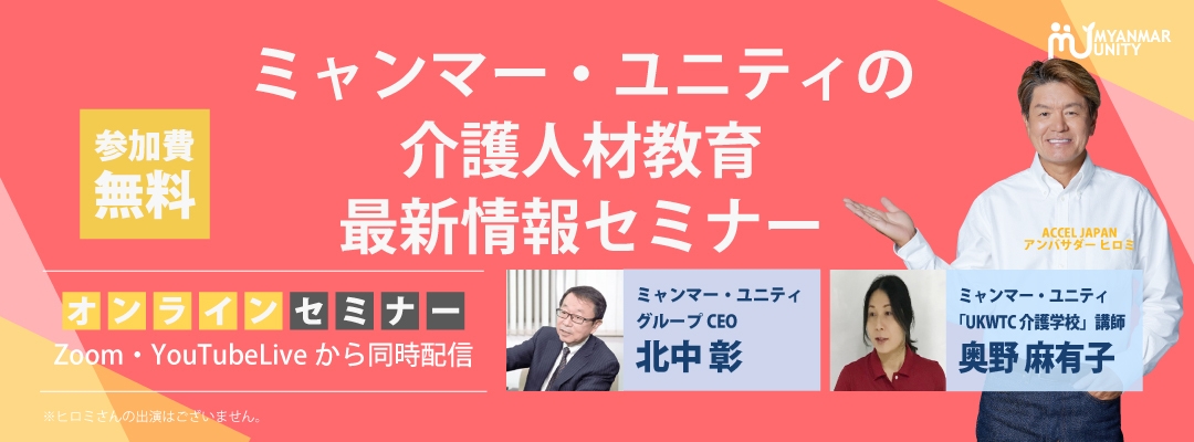 <介護教育のノウハウを一挙公開> ミャンマー・ユニティの介護人材教育最新情報セミナー <7/3 14時無料生配信> ~ほとばしる情熱を降り注いだ 外国人介護人材育成のAtoZがここに~