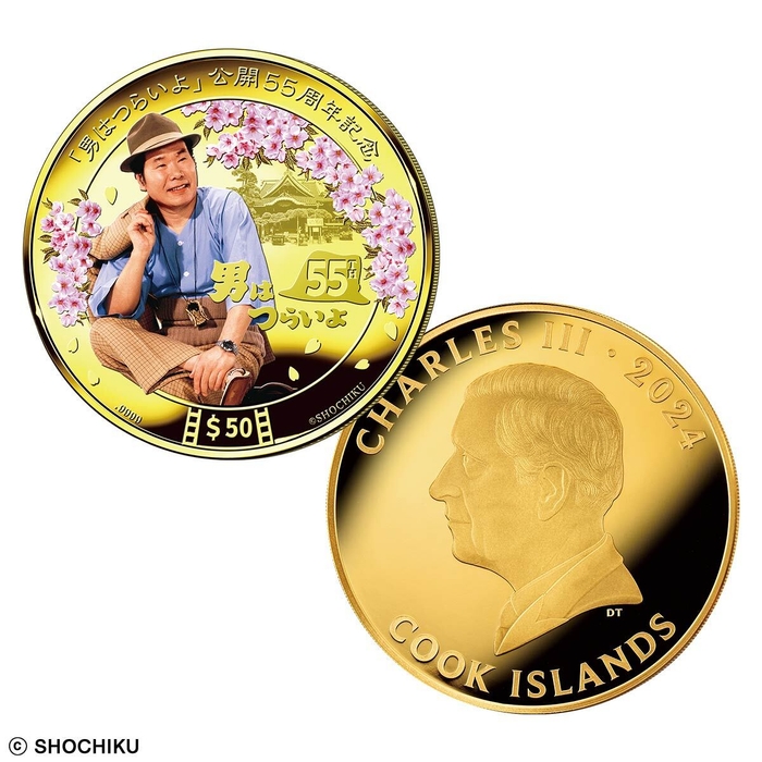 日本映画を代表する人情喜劇の名作シリーズ『男はつらいよ』(渥美清主演、山田洋次監督)が、昭和44年にされてから55周年。これを記念して、寅さんの愛すべき姿を色鮮やかにとらえたカラー金貨と銀貨が、クック諸島の法定貨幣として発行されます。