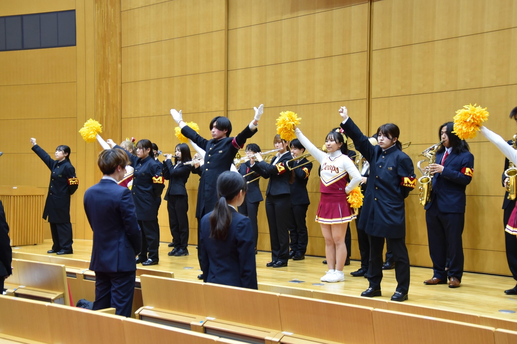 総会では初めに、出席者が應援團リーダー部とチアリーディング部、吹奏楽部とともに学歌を斉唱。体育会を代表して第49代会長の長井練さん(理工学部4年)があいさつに立ち「来年度には開学100周年という大きな節目を迎えます。この記念すべき年に向け、体育会が中心となり、名城大学全体をさらに活気づける取り組みを進めていきます」と述べました。