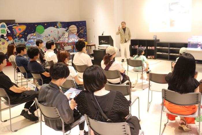 岡山理科大学の宇宙養殖実験水槽が展示されている、東京ドームシティ(東京都文京区)の宇宙体感施設「Space Travelium TeNQ(スペーストラベリウムテンキュー)」で8月3日、生物科学科の山本俊政准教授が好適環境水の仕組みから宇宙養殖の研究まで分かりやすく解説するトークイベントが行われ、約40人が参加しました。