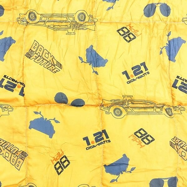ブランケットのデザインは、作中のキーアイテムでもあるタイムマシンであるデロリアンのシルエットや、タイムスリップに不可欠な「88MPH(時速88マイル)」のロゴなど、作品の世界観を象徴するアイテムを散りばめたデザイン。明るいイエローをベースにした遊び心満載のブランケットは、お部屋のアクセントにもなりますよ。