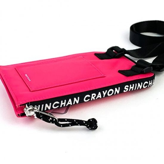 ファスナー部分にはクレヨンしんちゃんの文字が!白黒がビビットなピンクに映えていいアクセントになっています。