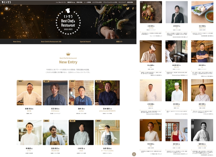 そのほか、レストランでの取り組みを通じて食の未来に貢献されたシェフに贈る「サステナブル シェフ&レストラン賞」、注目の若手として期待される「U-35 シェフ賞」、一年を通じて大きな反響があった話題のお店や記事に贈る特別賞として「ヒトサラ編集長特別賞」「ヒトサラ MAGAZINE特別賞」「ヒトサラチャンネル特別賞」を選出しています。食の目利き・舌利きであるプロの料理人と、食を紹介する編集のプロが選んだお店、いずれ劣らぬ名料理人と名店のリストをぜひお楽しみください。