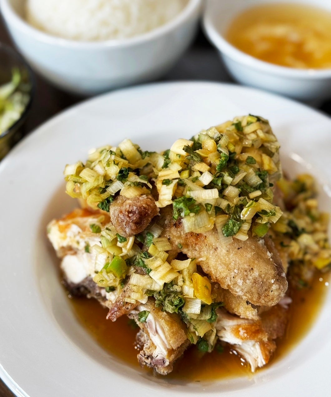 骨ごと揚げることによってお肉が驚くほどジューシーでボリューム満点。あっさりとした塩味の半身揚げに、刻み葱にパセリを加えた甘さ控えめ酸味の効いた香味ダレがよく合います。手で持ってかぶりつくのも旨いです。