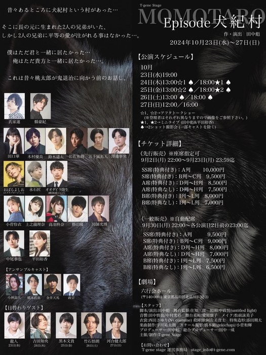 T-gene stage主催、『Episode 犬紀村〜MOMOTARO〜』が2024年10月23日 (水) 〜 2024年10月27日 (日)に六行会ホール(東京都 品川区 北品川 2-32-3)にて上演されます。