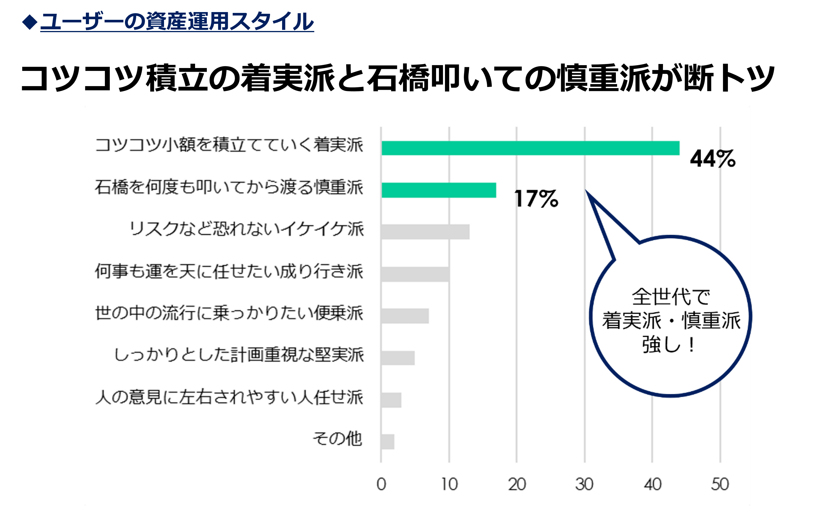 ✔ 来年から始まる新NISA制度やiDeCoへの関心もあってか、ユーザーの資産運用スタ イルは、コツコツ積立の着実派と石橋叩いての慎重派が断トツ