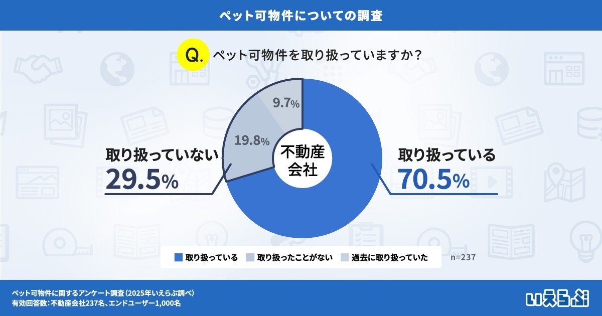 不動産会社に「ペット可物件を取り扱っていますか?」という質問をしたところ、「取り扱っている」と回答した不動産会社が70.5%、「取り扱ったことがない」が19.8%、「過去に取り扱っていた」が9.7%という結果となりました。